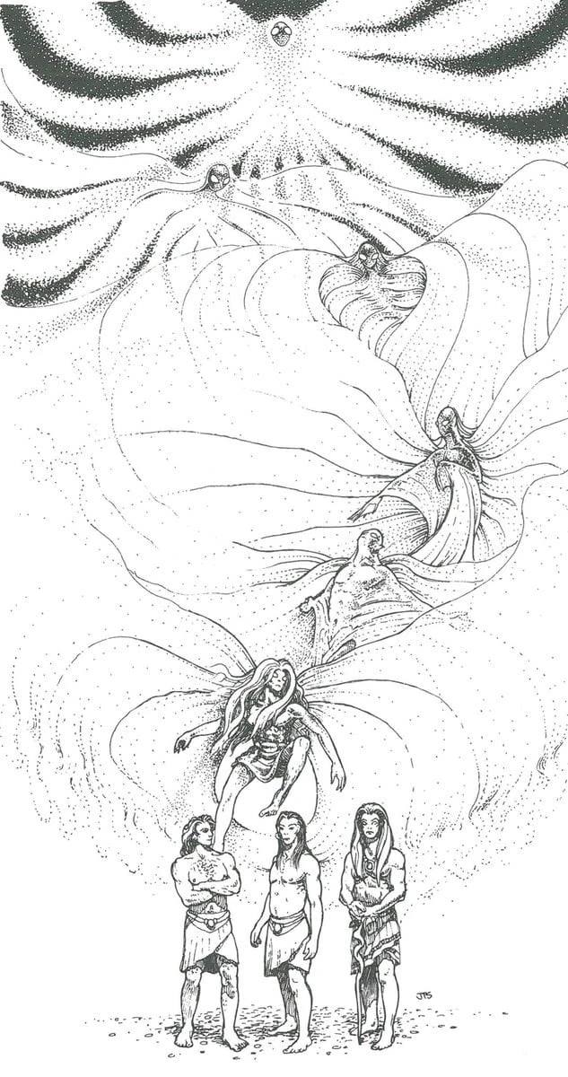 A preserver who transforms into an avangion undergoes a series of magnificent changes. In the earliest stages of this metamorphosis, the avangion retains almost all human characteristics. Closer to the ultimate form, the flesh becomes radiant silver, and wide, elegant gossamer wings sprout. Eventually, the preserver’s arms and legs become less and less useful. In the end, the legs are too fragile to support body weight, the arms too delicate for anything but fine manipulation.